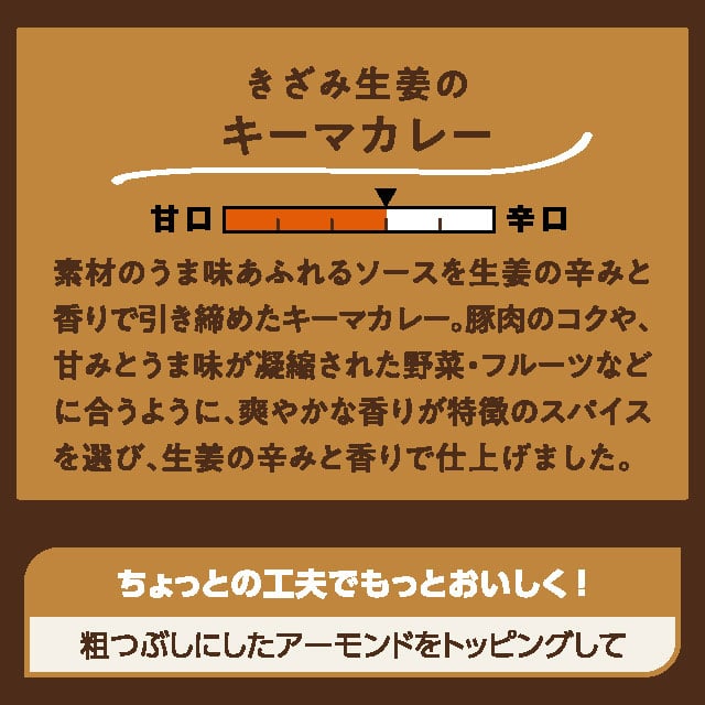 素材のうま味あふれるソースを生姜の辛みと香りで引き締めたキーマカレー。 豚肉のコクや、甘みとうま味が凝縮された野菜・フルーツなどに合うように、爽やかな香りが特徴のスパイスを選び、生姜の辛みと香りで仕上げました。