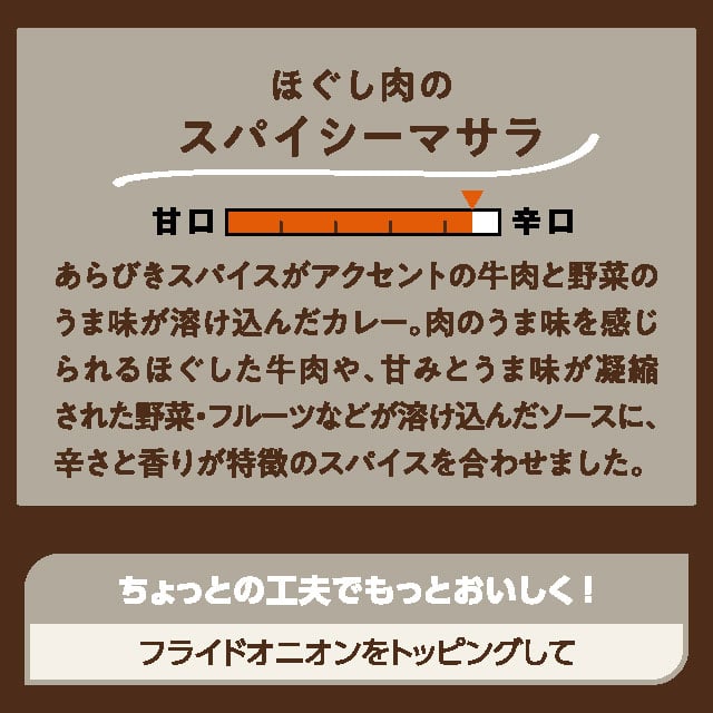 あらびきスパイスがアクセントの牛肉と野菜のうま味が溶け込んだカレー。 肉のうま味を感じられるほぐした牛肉や、甘みとうま味が凝縮された野菜・フルーツなどが溶け込んだソースに、辛さと香りが特徴のスパイスを合わせました。