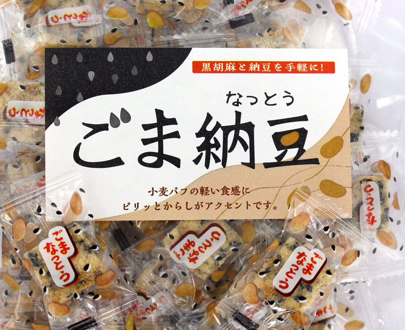 胡麻とドライ納豆を水飴等でからめ、おこし風にアレンジしました。 黒ごまの香ばしさ、癖なく食べやすいドライ納豆、 小麦パフのサクサク食感を楽しめる一品です。