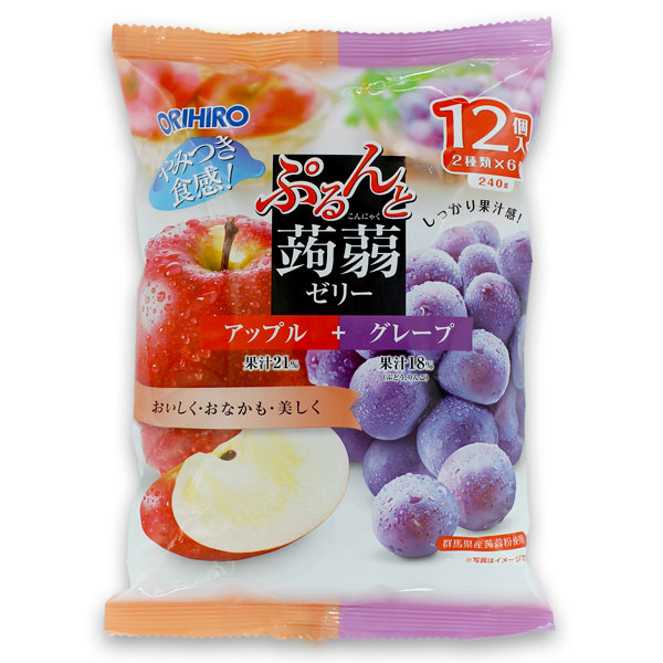 果汁感たっぷりの美味しく手軽なプチサイズの蒟蒻ゼリーです。吸い込み防止形態で、どなたでもお手軽にお召し上がり頂けます。アップルとグレープの2種類の味が楽しめるお得なアソートタイプ(2種類×6個の合計12個入り)。小腹がすいた時の手軽なおやつとしてお召し上がりください。