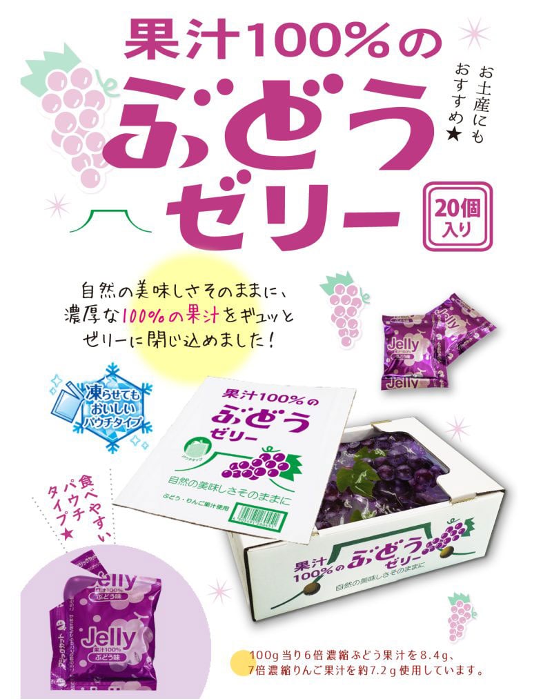 果汁100%ゼリーシリーズでも大人気のぶどう味です。 自然のおいしさそのままに、濃縮な100%果汁をギュッとゼリーに閉じ込めました。 濃厚な果汁の美味しさが、箱いっぱいに味わえます。 まるでミニチュア出荷箱なので、お土産や景品にもおすすめです。