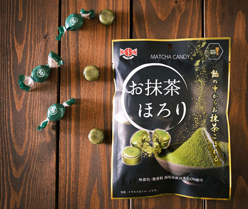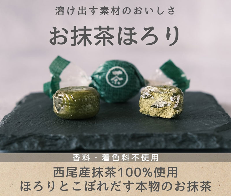 お抹茶ほろりは西尾の抹茶100%の抹茶粉末を、同じく西尾の抹茶を練り込んだ飴で包み込んだ、濃厚な味わいが魅力のキャンディです。沢山の抹茶を包み込んでいるため、飴の中から本物の抹茶がほろほろとあふれ出します。