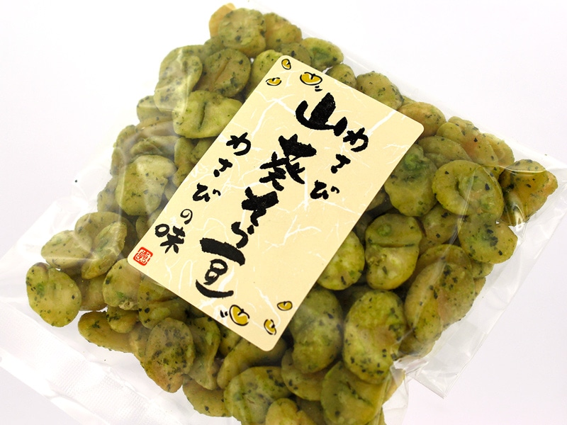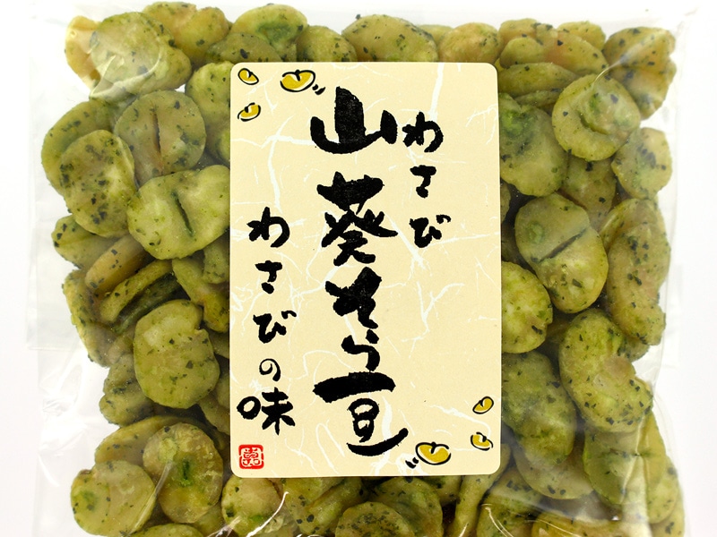 山葵(わさび)のツンとした風味と、そら豆の優しい甘みがクセに なる豆菓子です。山葵好きも舌を巻く絶品おつまみ豆です。