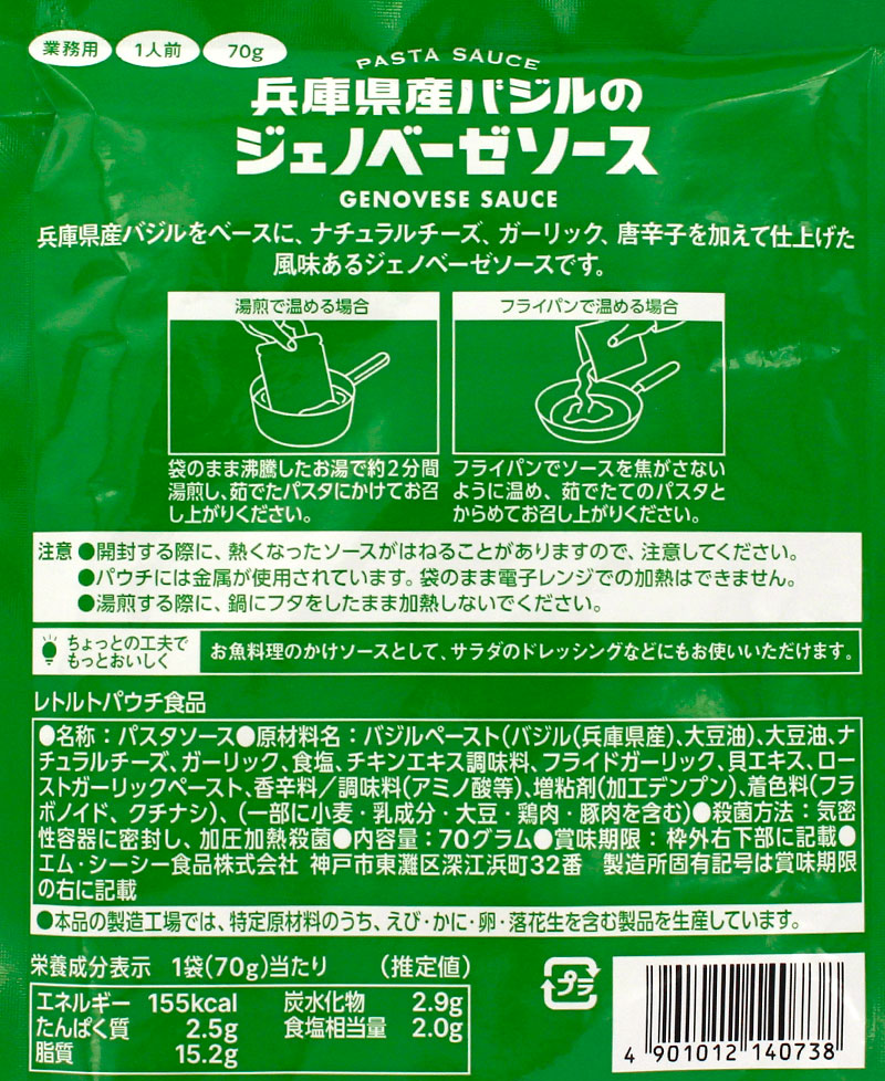 兵庫県産バジルをベースに、ナチュラルチーズ、ガーリック、唐辛子を加えて仕上げた風味あるジェノベーゼソースです。