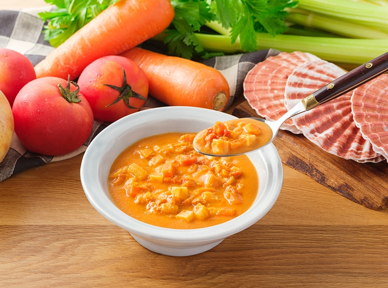 完熟トマトのうま味と香味野菜の甘み、クラムの風味を、北海道産生乳の生クリームがまろやかに包み込みます。じゃがいもやにんじんなど、具材感にもこだわった、トマトクリーム仕立てのクラムチャウダーです。