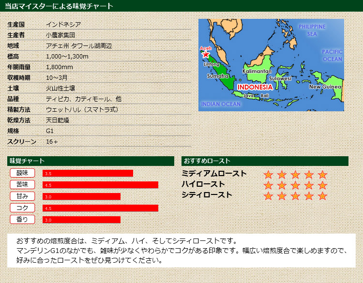 このコーヒーは、アチェ州のタワール湖周辺地区の赤実のみを、厳選された集荷人から買付を行うことで品質管理の一元化を行い、数回のハンドピック工程処理など安定した高い品質が両立した商品です。