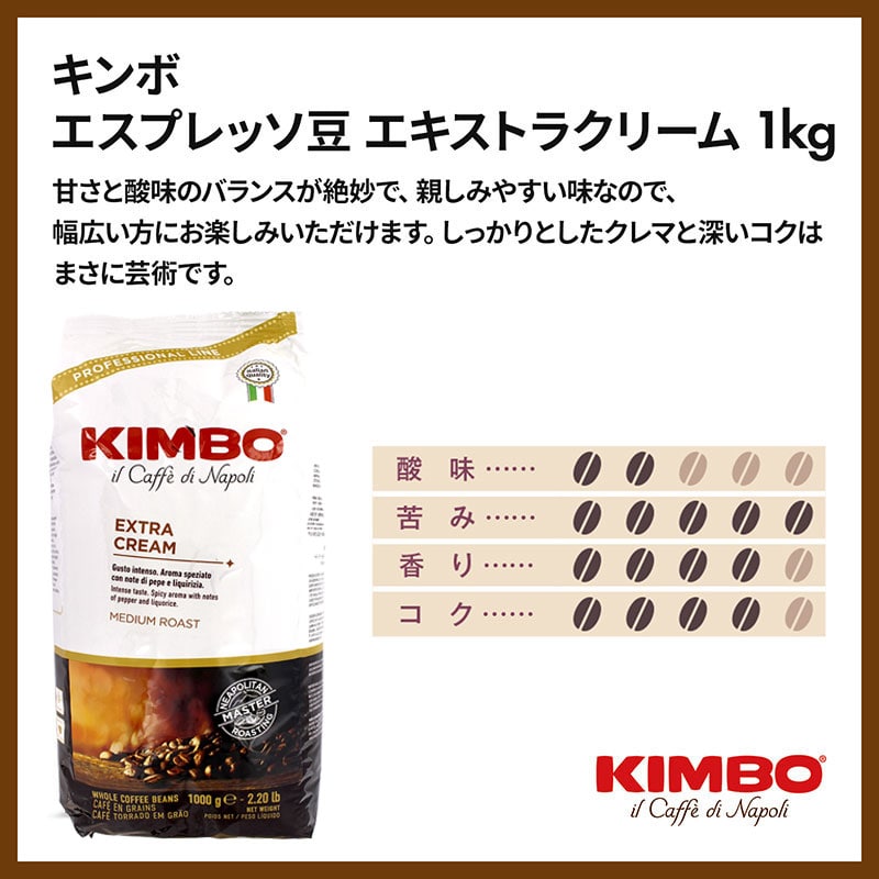 エスプレッソの聖地、ナポリを代表するコーヒーメーカー「キンボ」のエスプレッソ豆(1kg)です。 プレミアムロブスタ種を使った力強い味わいは、南イタリアのスタイルそのもの。しっかりとしたクレマと深いコクはまさに芸術です。カフェラッテやカプチーノにすると、甘いキャラメルチョコレートの風味をお楽しみいただけます。