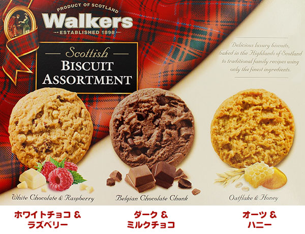 ホワイトチョコ&ラズベリー、ダーク&ミルクチョコ、オーツ&ハニーの 3種類のビスケット各6枚、計18枚が入っています。