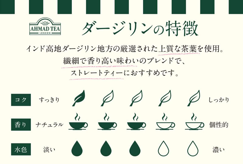 厳選された上質な茶葉を使用した、繊細で香り高い味わいのブレンドです。 フルーティーな香りが広がる、程よい渋みをもった味わいが楽しめます。