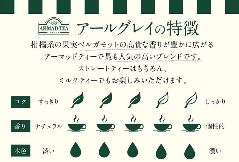 柑橘系の果実ベルガモットの高貴な香りが広がるアーマッドティーで最も人気の高いブレンドです。ミルクティーでもお楽しみいただけます。