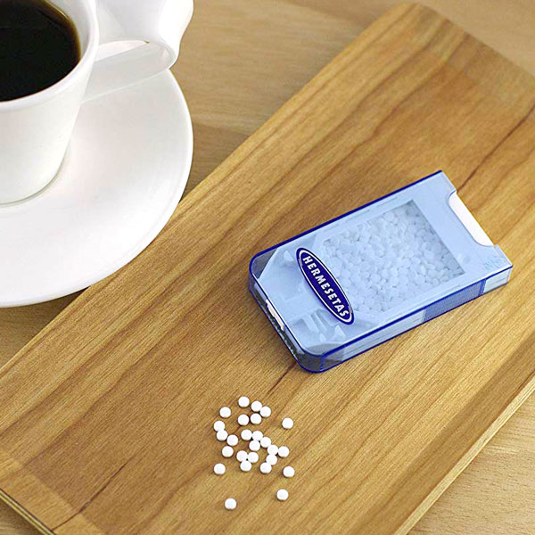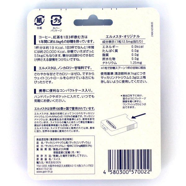 コーヒーや紅茶の砂糖代わりにご使用いただけます。 エルメスタは、独自の技術によって作られたサッカリンナトリウムの結晶です。 1粒で砂糖スプーン1杯の甘味に相当します。 ウエイトコントロールを心がけている方にもぴったり。 携帯に便利なコンパクトケース入り。