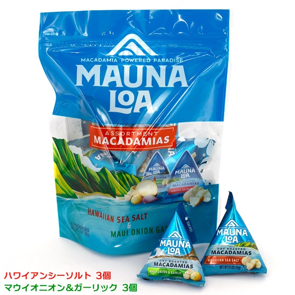 人気のマカデミアナッツ2種(ハワイアンシーソルト、オニオンガーリック)のミニパックを合計6袋詰合せたアソートバッグです。