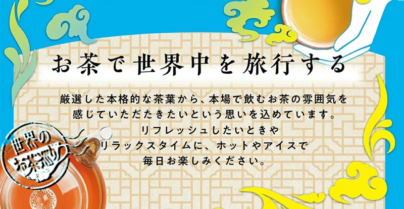 厳選した本格的な茶葉から、本場で飲むお茶の雰囲気を感じていただきたいという思いを込めています。 リフレッシュしたいときやリラックスタイムに、ホットやアイスで毎日お楽しみください。