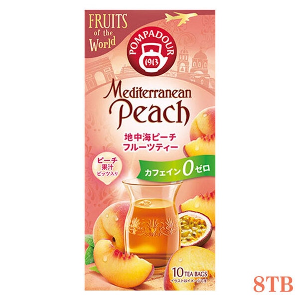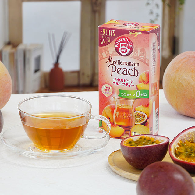 ポンパドールの地中海ピーチは、地中海に降り注ぐ太陽を浴びたピーチを思わせる甘くフルーティーな香りのピーチ果汁ビッツをブレンド。ターコイズブルーの海と輝く太陽を感じるフルーツ&ハーブティーをお楽しみください。