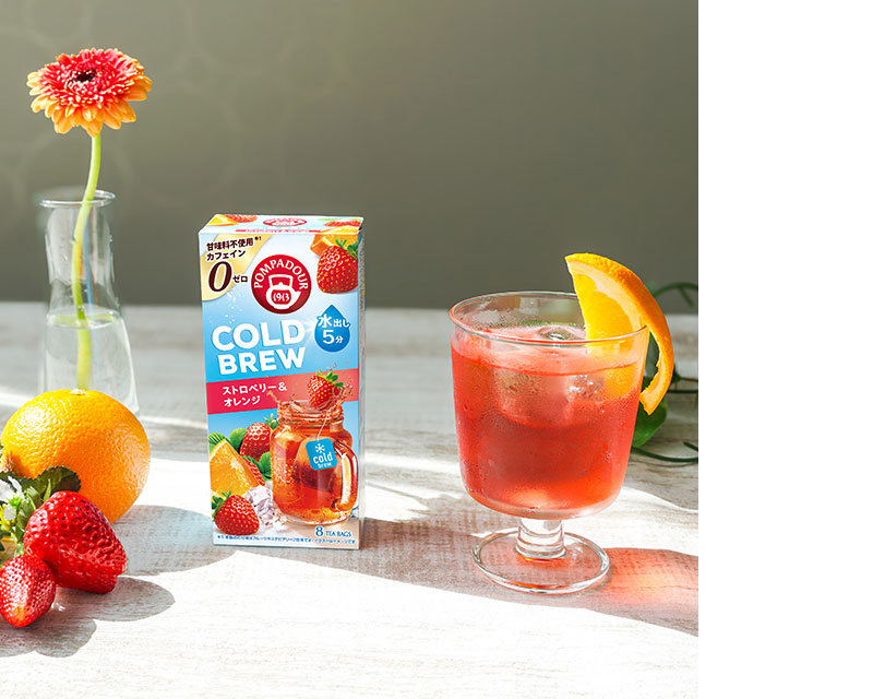 ストロベリーとオレンジがほんのり甘酸っぱい味わいの水出しハーブティーです。