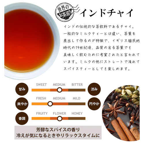 一般的なミルクティーとは違い、茶葉を煮出して作るのが特徴で、 イギリス植民地時代の19世紀頃、品質の劣る茶葉でも美味しく飲むために考案されたと言われています。 ミルクの他にストレートで淹れてスパイスティーとしても楽しめます。