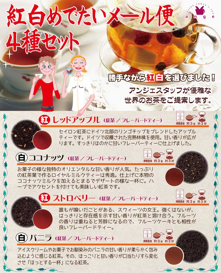 当店オリジナルティーブランド・アンジェからその季節におすすめの茶葉をピックアップし、 A4ファイルケースに詰めてメール便でお届けします。