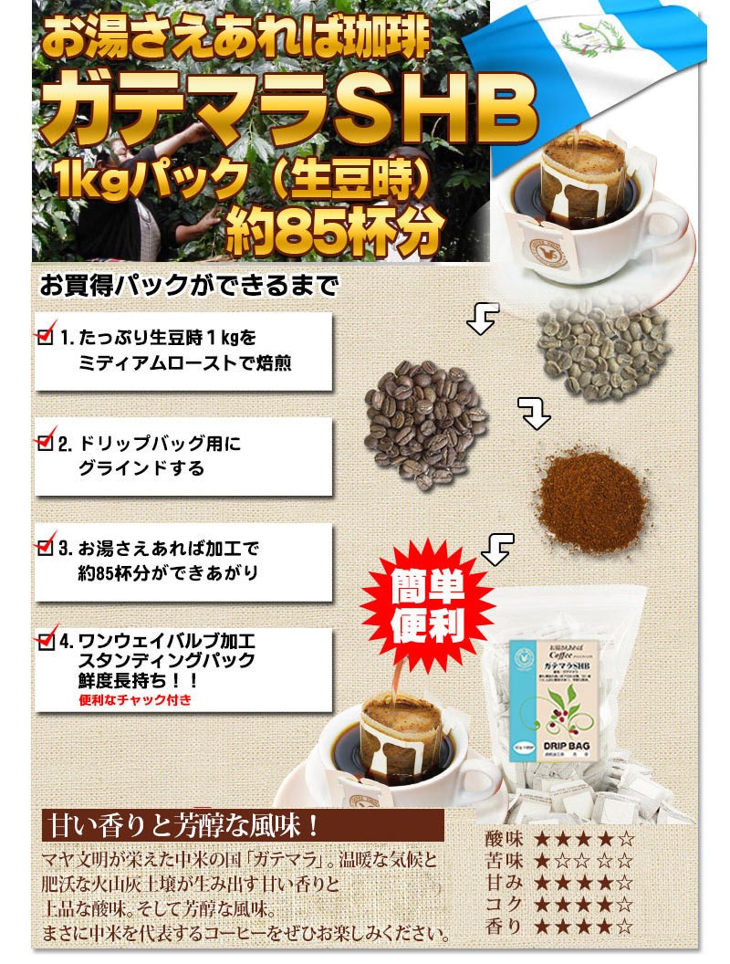 お湯さえあれば珈琲 ガテマラSHB お得な生豆時1kgパック 10gx85P