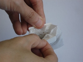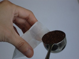 (1)簡単ドリップバッグフック式を1枚取り出してコーヒーを詰めます。![]() お好みでメジャースプーン1杯分のコーヒー粉を詰めます。 |