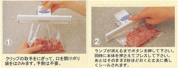 ■クリップシーラー Z-1 使い方は簡単、袋をクリップしてボタンを押せば約1秒ほどでシーリング。 | |