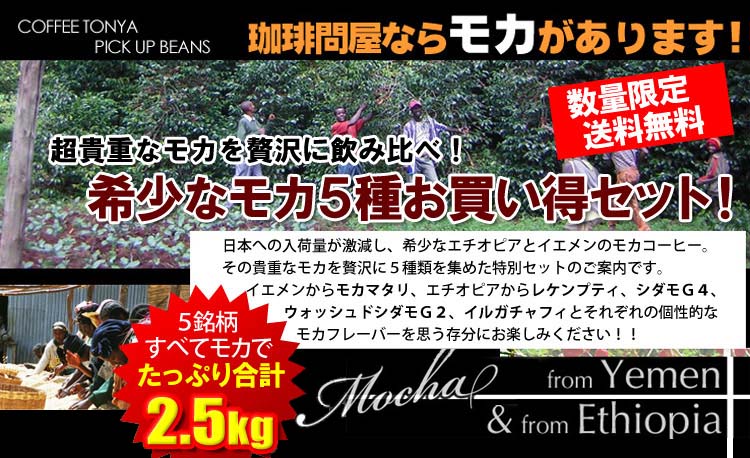 ◆ 贅沢!たっぷり2.5kg モカコーヒー5種飲み比べセット(生豆時500g×5銘柄) 送料無料