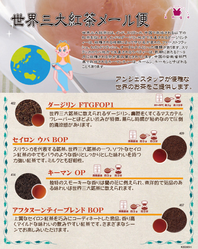 当店オリジナルティーブランド・アンジェからその季節におすすめの茶葉をピックアップし、 A4ファイルケースに詰めてメール便でお届けします。