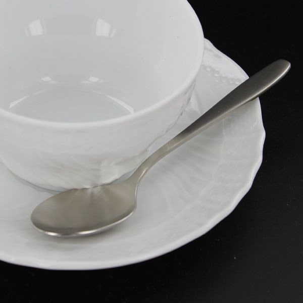 18-12ステンレス・スチール製でオールサテン仕上げのティースプーン。シンプルなデザインで使いやすい。