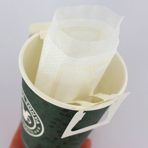 ドリップバッグのフックとフィルターは素材同士をヒートシールにより融着しており、接着材は一切使用していません。 フック、フィルターとも食品添加物等の規格基準に適合した安全な素材を使っています。