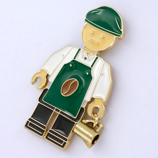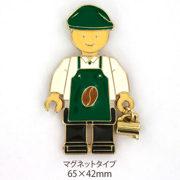 グリーンエプロンにグリーンハンチング帽の 男性フィギュアのバリスタピンバッジです。