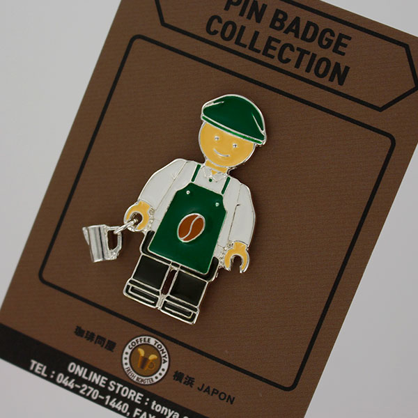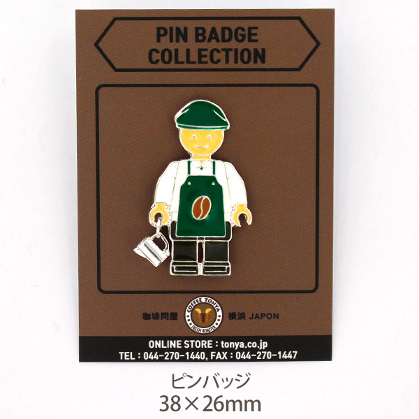 グリーンエプロンにグリーンハンチング帽の 男性フィギュアのバリスタピンバッジです。