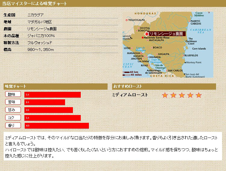 このジャバニカという品種は、その昔オランダ人がインドネシアのジャワ島に エチオピアのカッファを起源とするコーヒー(ロングベリー)を植えました。 そこで育ったコーヒーがジャバという品種。そのジャバが長い時間をかけて 巡りに巡って遠い中米のニカラグアにもたされました。 そして長い年月を経て、ニカラグアで育ったジャバを「ジャバニカ」と呼ぶように なったそうです。